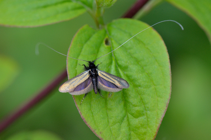 Adela reaumurella This moth is also known as the Green (or Oak) Longhorn. They fly in sunshine, often in a swarm when they are mistaken for flies so that a common and attractive little moth is rarely noticed. © Dave Sims